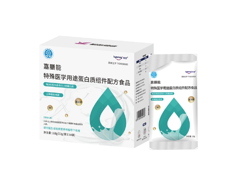 嘉膳能®特殊医学用途蛋白质组件配方食品,是一种蛋白质含量83.2%的营养组件,配方主要由动物短肽、动物整蛋白、植物整蛋白构成,形成稳定的蛋白质吸收梯度。适用于在各类疾病治疗中作为蛋白质补充来源。